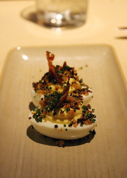 The burger aside, most of the menu is made for sharing. There are wedges of chilled dill cucumber pickles ($6) that snap when you bite into them and have a bright taste rather than a sharp one; long beans ($6) fried in beer batter that’s as delicate as tempura; and deviled eggs ($6) that are strewn with crisp quinoa for texture and perhaps a bit of virtuousness to offset the big bite of bacon that’s also on top.