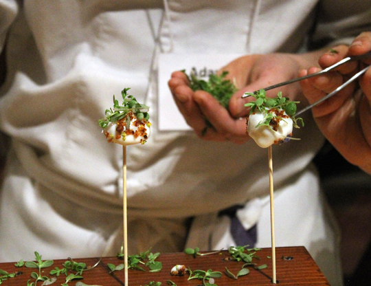Andre Chiang of Restaurant Andre in Singapore adds the finishing touches to smoked potato and scallop fondue pops.