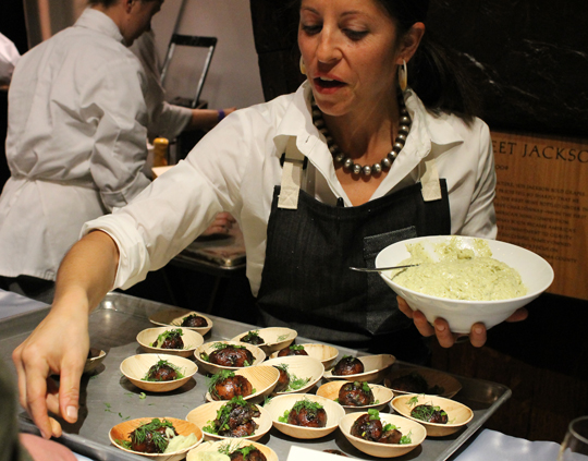 Chef Cortney Burns of Bar Tartine dishing up incredible smoked potatoes with black garlic vinaigrette and fermented ramp mayo.