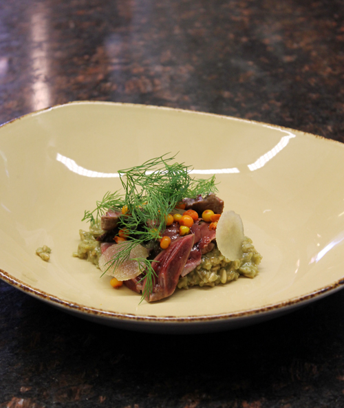 His porridge of cracked oats with Krondill cheese, duck hearts, duck liver, apple and sea buckthorn.