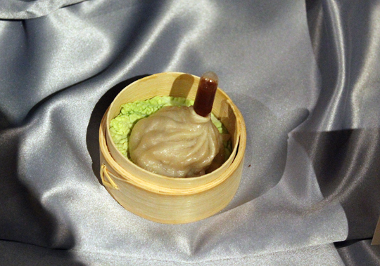 A clever xiao-long bao with black vinegar and chili sauce syringe by Chefs David Bass and Paul Fiorentino.