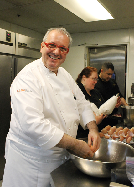 Chef Ken Frank holding a plate of black truffle risotto with quail that was made in a demo by Chef Roberto Donna.