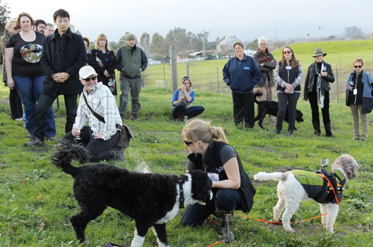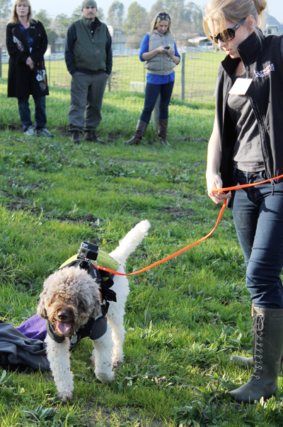Alana McGee preps her truffle dogs for a demo on the Sinskey property as vintner Rob Sinskey (white hat) and American Truffle Company Managing Director Robert Chang (behind Sinskey) look on.