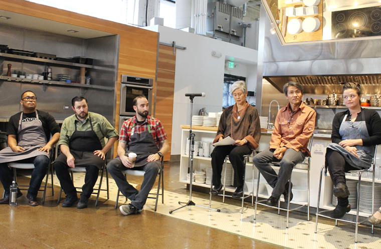 The panel (L to R): Chef Johnny Madriaga, Chef Bill Corbett, Chef Omri Aflalo, Google’s Olivia Wu, Hodo Soy Founder Minh Tsai, and Chef Kim Alter. (Not shown, Tara Duggan, San Francisco Chronicle food writer.)