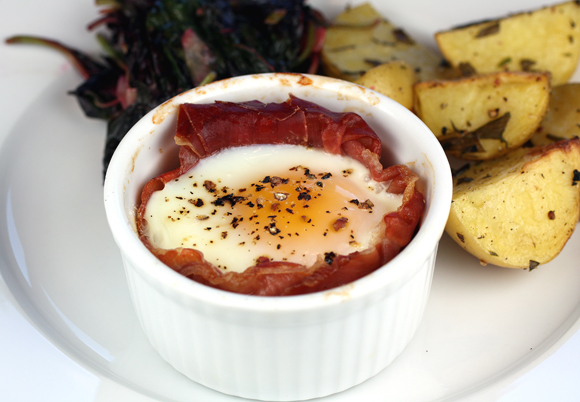 His ol’ Pyrex dish gives way to ramekins in this rendition. They’re lined with paper-thin slices of prosciutto crudo (the cured but technically “raw” ham that you all love wrapped with melon) to form “cups” that get baked in the oven till crisp. The “cups” will shrink a little, but don’t fret. Just dollop a little rosemary- and chive-infused cream on the bottom of them, then crack an egg into each one. Bake again until the eggs are set. Serve with buttered toast, roasted potatoes, a light green salad or sauteed veggies.