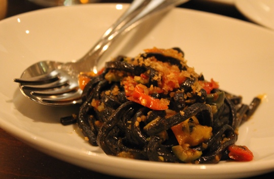 Squid ink fettuccini ($11/$19) is a study in colors with the coal-hued noodles a backdrop for bright red cherry tomatoes, fennel, and golden fried breadcrumbs. The fruity acidity of the tomatoes and the crunch of the crumbs make this dish a favorite.