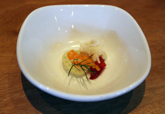 A trio of banchan is complimentary. That night it was kimchee, bean sprouts and kombu. We also ordered a trio of that evening’s pickles ($8), which were daikon, a very tart and spicy radish, and crunchy carrots. The amuse was cod with bottarga, a bit savory, a bit salty.