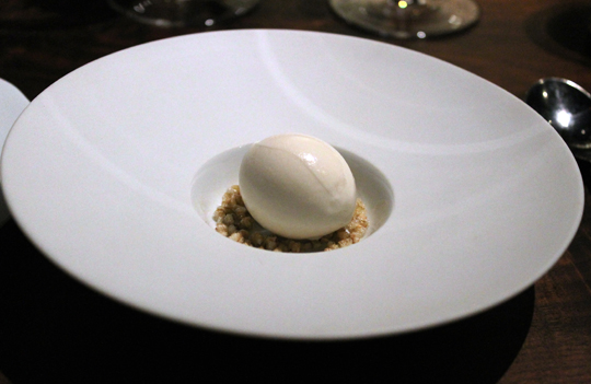 Next, a study in buckwheat: The most perfectly shaped quenelle of buckwheat ice cream sprinkled with toasted buckwheat arrived with a puffy buckwheat souffle. You puncture the souffle and drop the ice cream into it. The result is the flavor of Japan in a French dessert. It’s toasty, nutty and slightly earthy, and refreshingly restrained in sweetness. To cap it all off, a server comes by to pour cups of hot toasted buckwheat tea.
