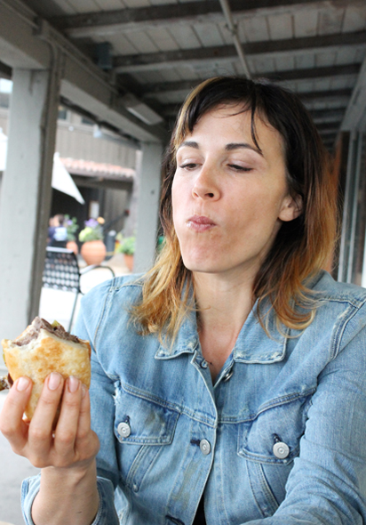 Anya Fernald being a good sport by letting me snap a pic when she took a bite of the Philly cheesesteak.