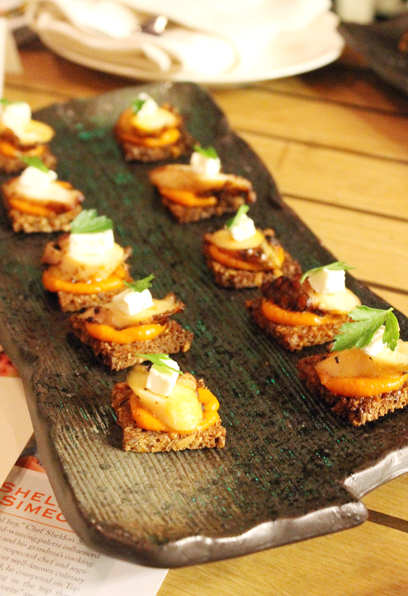 That was followed by a trio of appetizers: Spoonfuls of luscious Kona Kampachi cubes, served raw, and topped with avocado and coconut, prepared by Simeon. (So good, I had two!) Maui tako garnished with piperade and the tang of goat cheese by Scheer. And squares of rye bread topped with blue cheese, honey and salted olives by Bancaco.