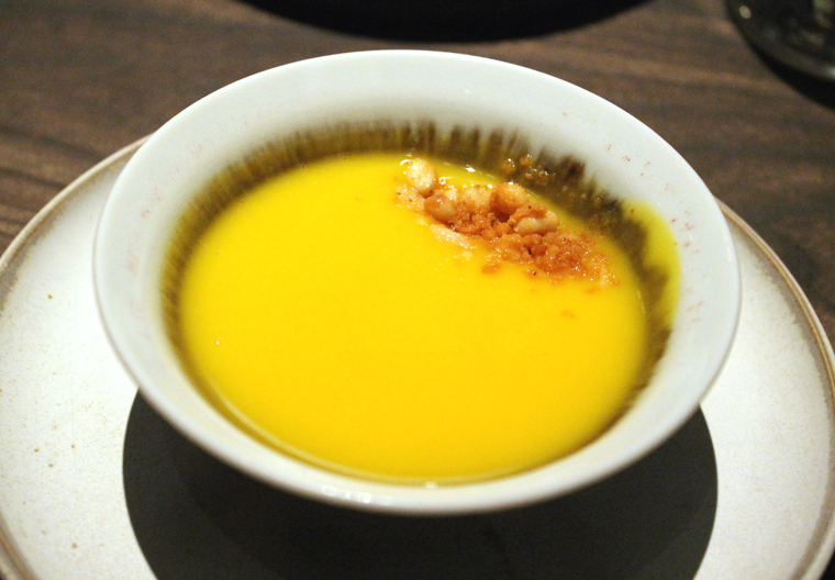 The tasting menu began with a curl of raw big eye tuna with yuzu gel so aromatic that you could smell its lovely floral-citrus fragrance the minute it was put down on the table. It was a one-bite wonder — a tiny thing with such big presence.