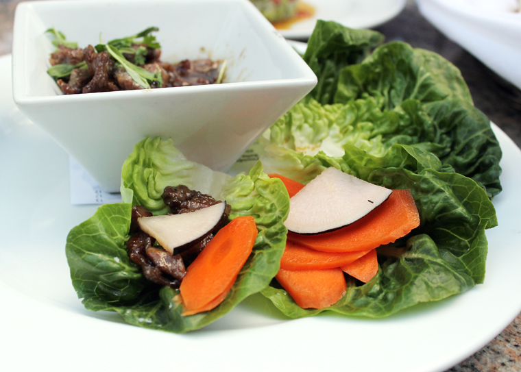 Ssam Lettuce Cups ($18) is an assemble-it-yourself dish. A small bowl of soy-marinated sirloin strips arrives with lettuce leaves, and pickled carrots and radishes. Fold up a little of everything in a lettuce leaf and enjoy. The flavors are a little more Chinese than Korean, but tasty nevertheless.