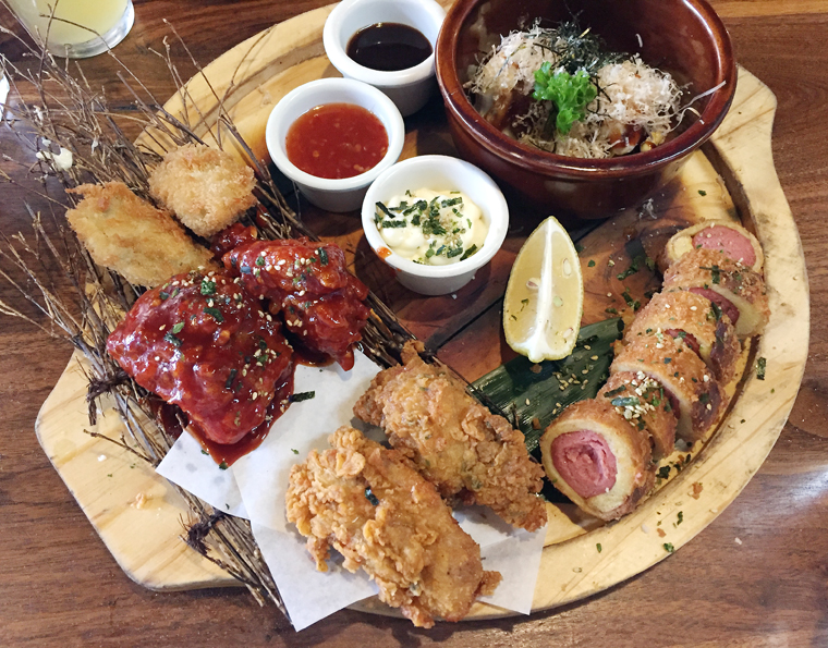 Also on the Happy Hour Menu is the Sampler ($18) of assorted appetizers. You can tell the restaurant and Chef Nick Yoon take pride in presentation here. A groaning wooden tray is delivered to the table with fried oysters, Korean fried chicken, takoballs, and “Doggy,” the restaurant’s take on a corn dog. Everything is arranged just so, with the fried chicken and fried oysters arrayed on decorative twigs.