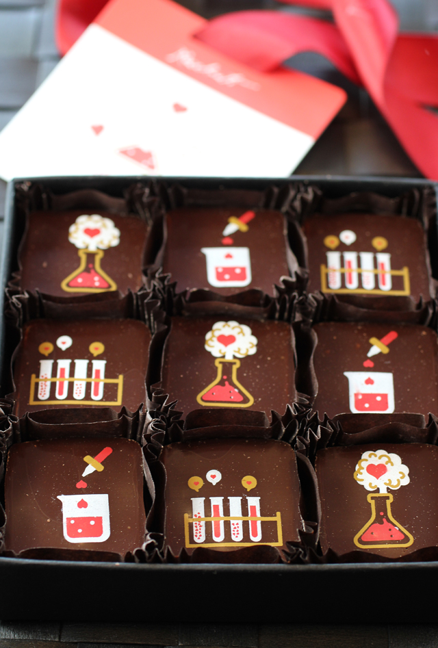 The Chemistry of Love ($28) box holds nine squares of the super popular Burnt Caramel truffles. Each is decked out in hand-done artwork that plays off the chemistry theme, such as a science flask billowing a cloud with a heart in it; and a rack of test tubes with hearts spewing from them.