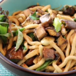 Dishes Made From A Previous Farm Box Delivery: Stir-Fry Udon Noodles with Eggplant, Portobello Mushrooms, Thai Basil, and Celery Leaves