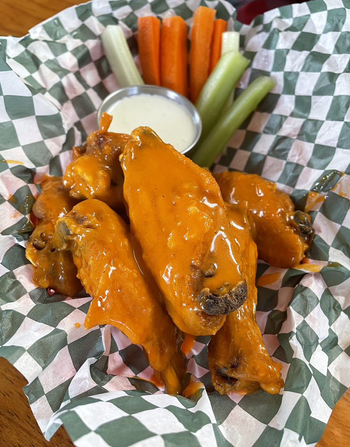 We started with the Buffalo wings ($16) that arrive tender and juicy with crispy edges, and blanketed in a velvety orange sauce heavy on Frank’s RedHot. When you place your order, you’re asked if you’d like the wings “mild” or “hot.” We opted for “mild,” which had plenty enough heat to warm the throat but not incinerate it. The wings come with the requisite celery and carrot steaks, and blue cheese dressing.