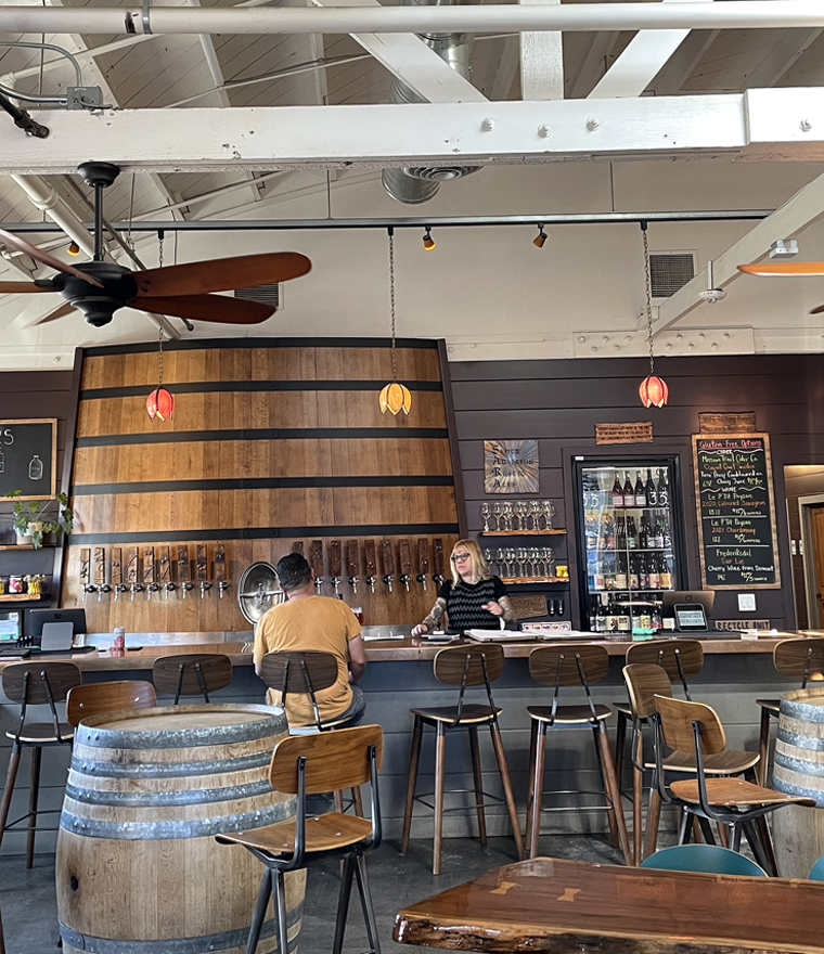 It’s open seven days a week with weekends packed. On a midweek lunch-hour, though, it’s easy to find a seat, either outside on the small patio with wine-barrel tables or inside at artsy, live-edged wood tables. On a nice day, they keep the doors to the patio wide open, so you can easily snag a seat at a table inside that practically feels like outside with the feel of the coastal breezes.