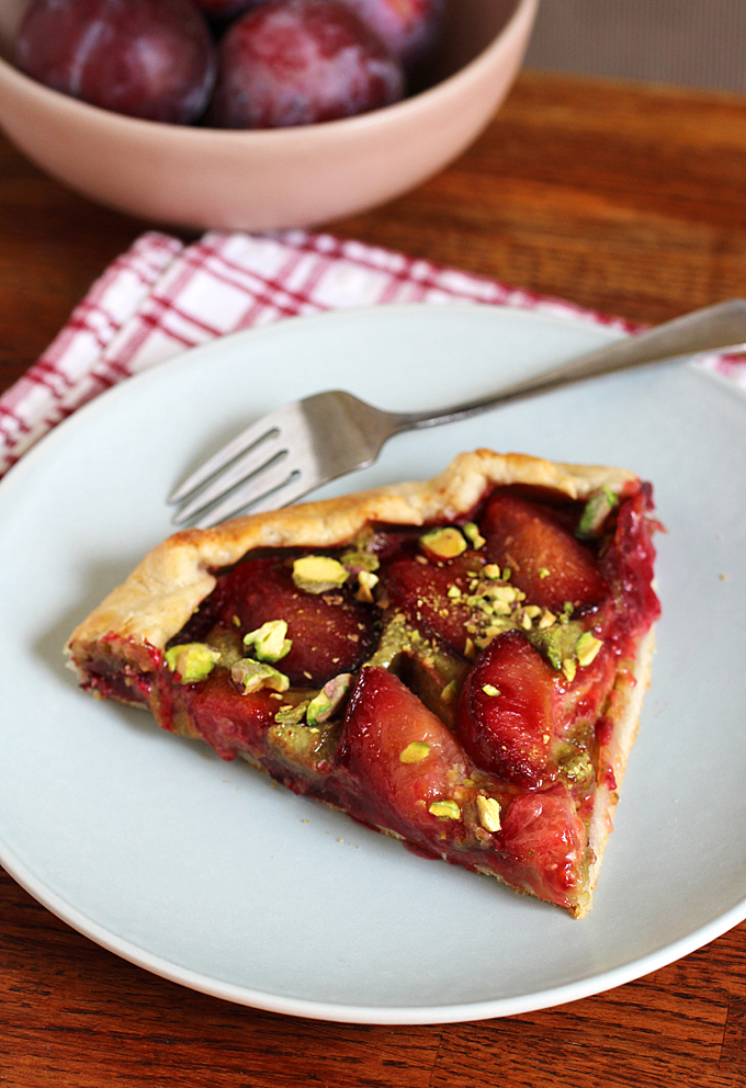 Sprinkle on some more chopped pistachios for a final touch, then enjoy. While Gilbert likes to garnish hers with a scoop of ice cream, I like mine just as is to fully appreciate the tangy-sweet taste of the plums alongside the intense nuttiness and slight earthiness of the frangipane.