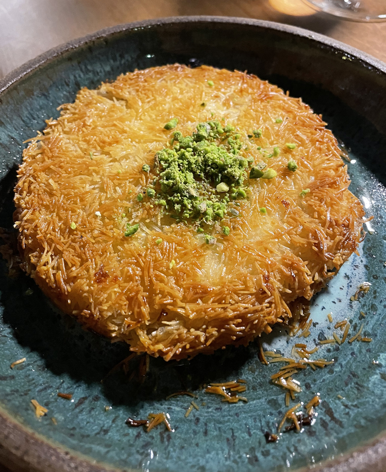 Warm, stringy, gooey, melted cheese might not be your first thought for dessert, but then you haven’t met kunefe ($14). This Turkish pastry pie indeed has a center of milky mozzarella, all wrapped in finely shredded phyllo threads, then pan-seared until crisp and golden brown with plenty of butter and sugar syrup.