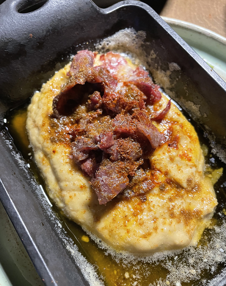 Hummus comes warm here and topped with pastirma ($18), house salt-cured and air-dried beef that’s tender, and spiced with a hint of sweetness.