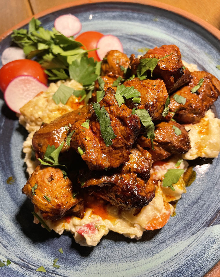 Carnivores will rejoice in the alinazik ($42), Turkish-style, mesquite-grilled tenderloin chunks cooked on a skewer until juicy and tender as can be, then piled atop creamy eggplant-labne, and more of that paprika-stained butter.
