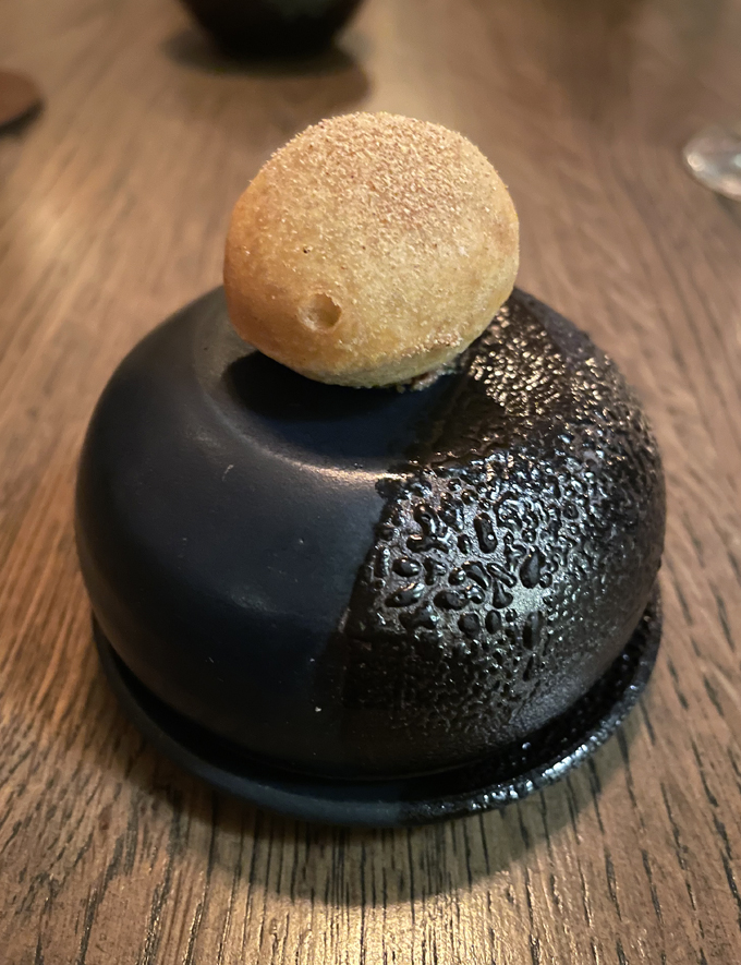 Alter does a playful take on takoyaki, forming a dashi-flavored spherical soft pancake into a golden donut hole topped with uni and grated truffle.