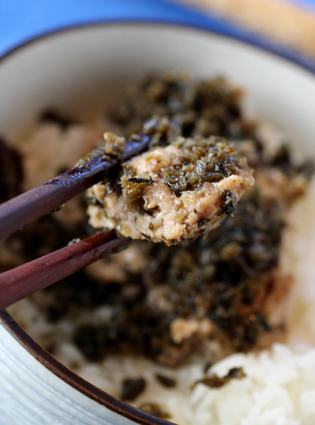 In a small bowl, soak the preserved mustard greens in room-temperature water for 1 hour. (Half an hour will suffice if you’re in a hurry.) Rinse the greens thoroughly under running water to get rid of any dirt or grit. Pat dry with paper towels or run through a salad spinner to dry (if your greens are in large pieces). Mince the greens finely (if they are not already minced).