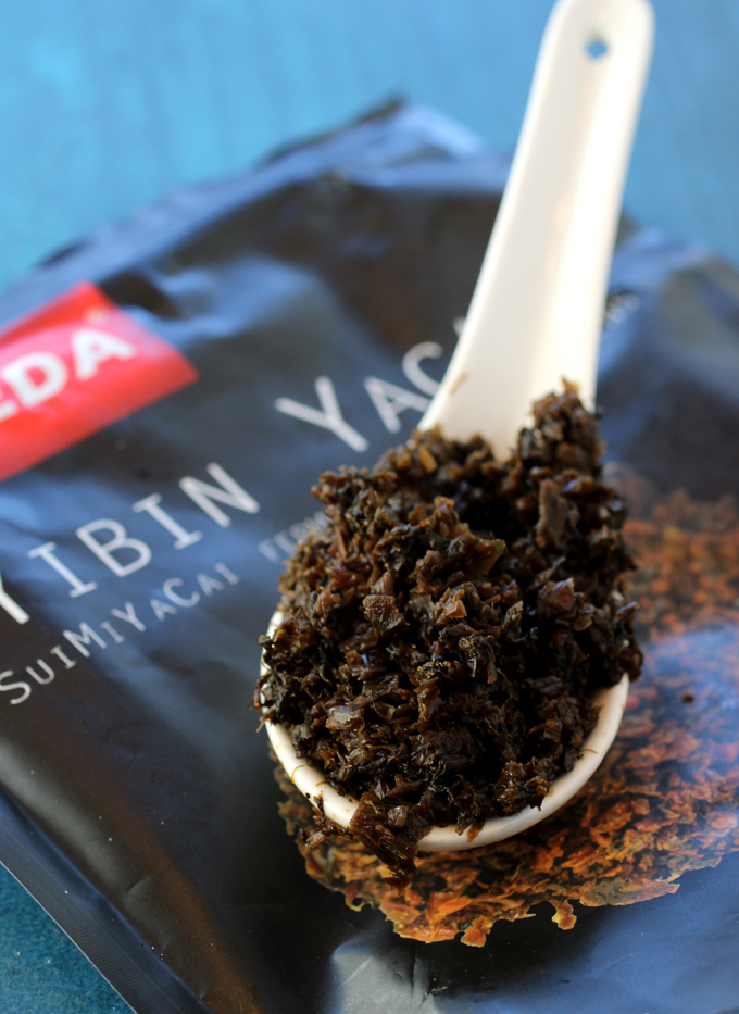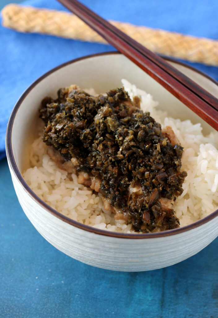 Preserved mustard greens can be found in packages in Asian markets. They are the stems of mustard greens that have been dried, fermented in salted water, boiled with brown sugar, then fermented again with other spices such as clove, garlic, and nutmeg. If you make your own, you probably leave the stems in large pieces. However, if you opt for store-bought, you’ll find them already finely shredded. This condiment is an umami bomb with a little saltiness along with an earthy-funky fermented quality that gives it a long finish on the palate. Some people liken it to a Chinese version of sauerkraut. To me, it is very reminiscent of the taste of Chinese fermented black beans.
