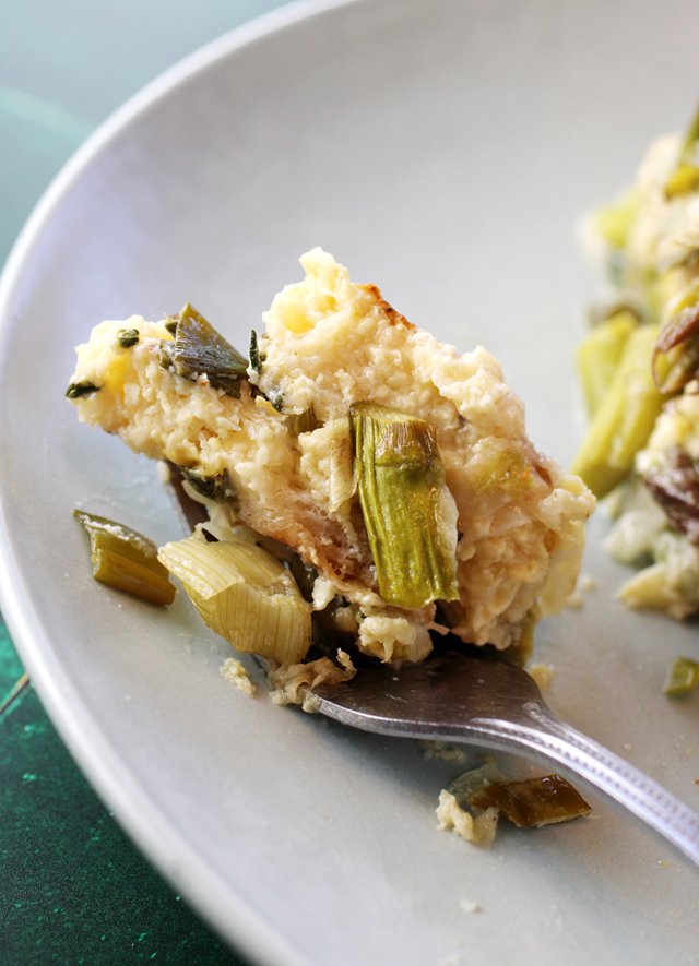 When it emerges, the cheese will have melted beautifully on top, vibrant bits of green will have poked through, and the layers will have almost coalesced into one for a look akin to a quiche.