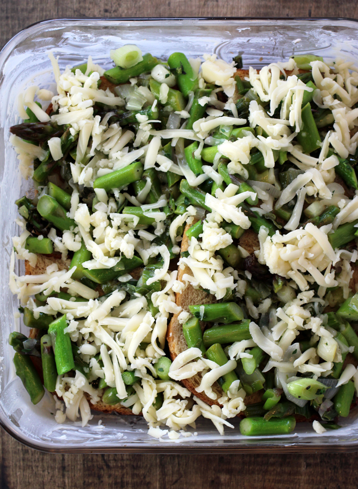 Scatter half of the asparagus mixture over the top (about 1 cup). Follow with about half of the cheese. Repeat with the remaining bread, then asparagus mixture, then the remaining cheese. Evenly pour the egg mixture over the top and in between gaps. Cover tightly with plastic wrap and gently push down on the top to help encourage the bread to soak up the custard. If you would like to bake as soon as possible, let the strata stand for 20 to 40 minutes with four full cans of food (or something else) to weight it down and encourage soaking. Alternatively, refrigerate the strata overnight.