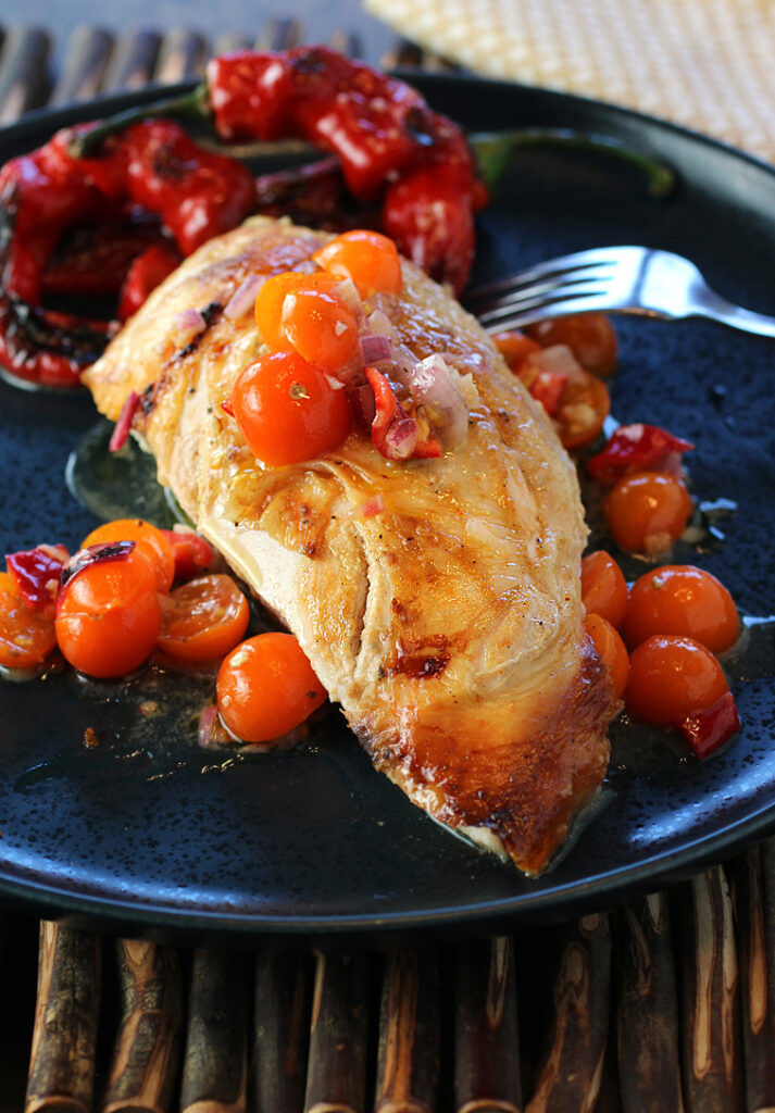 Moreover, this juicy chicken is served with a delightfully named “Moyo Sauce Goes with Everything” that’s a chunky, salsa-like sauce that’s bright, refreshing, and stars summery cherry tomatoes, making it perfect for this time of year.