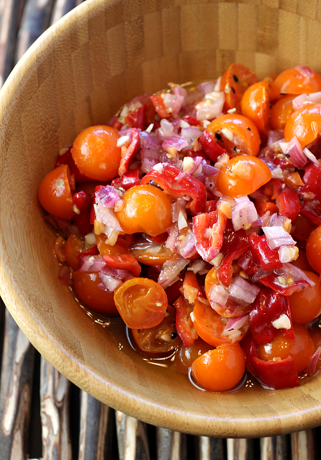 The moyo sauce couldn’t be easier. Just gently mix together cherry tomatoes, red onion, minced garlic, chopped habanero, a splash of lime juice, and that little bit of Dijon mustard. Diced green bell pepper is also in the mix, but I swapped that out for chopped Jimmy Nardello peppers instead. Just coming into season now, they add a fruitier, sweeter peppery taste.