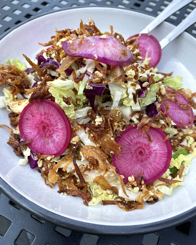 I dream of having the napa cabbage slaw ($17) again just for lunch. It’s a riot of textures, colors, and flavors that really showcases California ingredients with an Asian sensibility. It’s a beautiful dish, loaded with green and red cabbage, plus long slices of chewy fried tofu skin. Fried shallots and peanuts add delightful crunch, while Thai basil, rau ram, and mint leaves bring their perfume and floral notes.