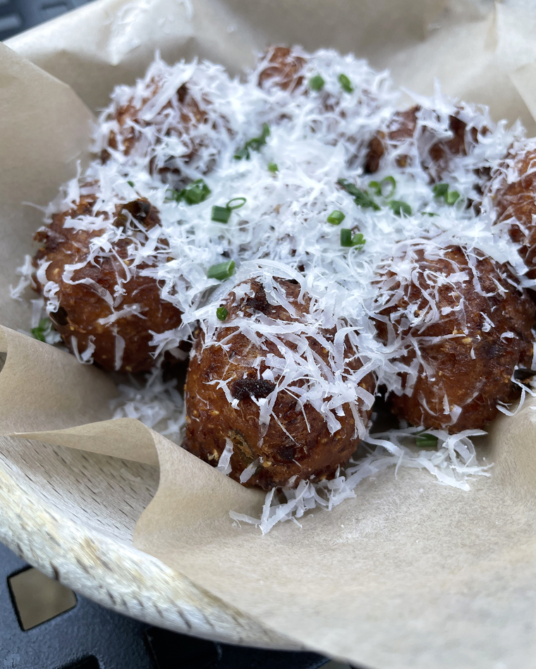 One of the restaurant’s signature dishes is the savory donuts with bacon ($10), which are a must-order. They arrive hot and super crispy, showered with Pecorino. Made with ricotta, these two-bite donut holes are tender and soft, even a teeny chewy. They get extra savory from garlic, bacon, and scallion. It’s like eating the very best, fresh-out-of-the-fryer tater tots.