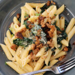 Bring the same pot of salted water back up to a boil, and add the penne. Cook until al dente, then drain while reserving 1/2 cup of the pasta cooking water.