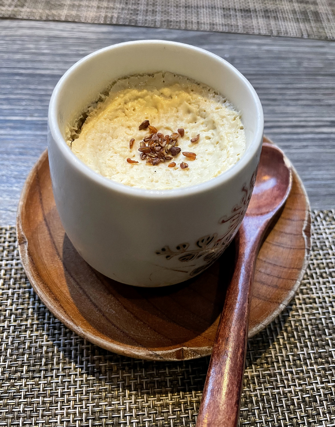 In keeping with the soba theme, there’s soba pudding ($7.50) for dessert. Served in a small ceramic cup, it’s creamy, dense, a little grainy, and roasty-toasty tasting. Candied buckwheat groats dot the top to add crunch and subtle sweetness.