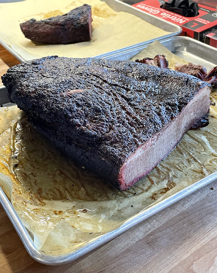 The brisket ($18 per half pound) is hickory smoked Black Angus with the characteristic smoke ring. You don’t need a knife with this meat that yields easily to the tines of a fork without being dry at all, which is no easy feat with this cut.