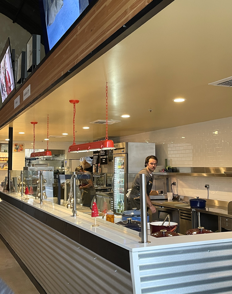 Then, carry your tray to any available table in the dining room. There’s a stand where you can dispense three types of barbecue sauce to try: traditional, sweet, and spicy.