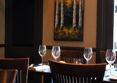 The 80-seat dining room is warm and clubby with dark wood tables, exposed wood beams, brick accents and a black granite bar. On an early evening, it gets plenty of light, too, from floor-to-ceiling windows.