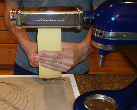 As my brother, Dale, stood poised at the counter beside his KitchenAid mixer, I noticed my husband watching him. Dale combined the ingredients for the dough in the mixer bowl, then gave the dough a brief kneading by hand. Then, he started to feed the dough through the roller attached to the mixer that looked for all the world like an adult Play-Doh pumper machine. The roller flattened the dough effortlessly. Again it went through, and again, each time emerging a little thinner. Then, Dale changed the rollers to a cutting one, and fed the dough pieces through again, as beautiful, long strands pushed out the other end.