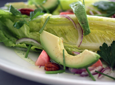 Dinner began with one of those amazing salads — whole hearts of romaine, strewn with shaved red onions, pickled radishes, spiced pecans and avocado wedges. It was dressed with creamy green goddess dressing.