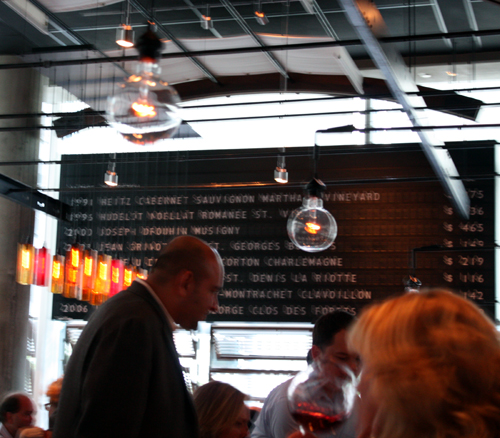 The centerpiece is a custom-made flip board like the ones you see at train stations that tell the arrival/departure times. Only this one lists wines where only one bottle remains in stock at the restaurant. If someone buys it, the board flips to erase the wine selection. How cool is that?