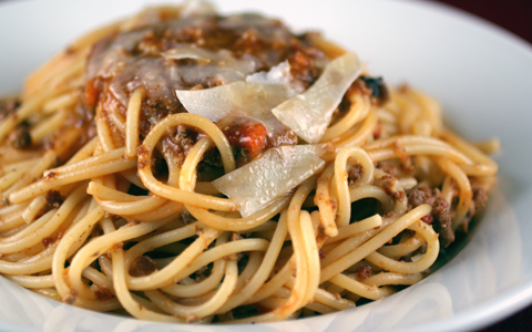 Tossed with hot spaghetti, it makes for a most satisfying dinner. The sauce is hearty, with long-simmered, developed flavors, despite the fact that all I did was heat it up.