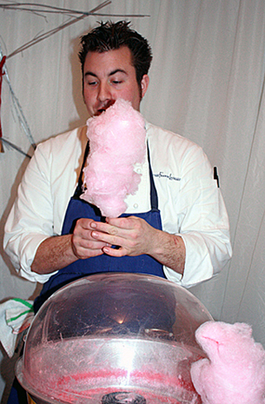 Fun was definitely in the air on Sunday. If you’re used to the serene environment of the French Laundry, this was noisy, crowded and oh-so casual. It was fun to see cooks who normally turn out exquisite “Oysters and Pearls” instead creating fluffs of pink cotton candy and truffled popcorn.