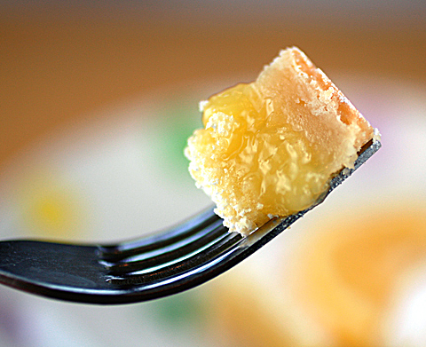 On the bottom is a buttery shortbread crust. In the middle, the smoothest, thickest, most velvety lemon curd-like filling made with six eggs for extra richness.