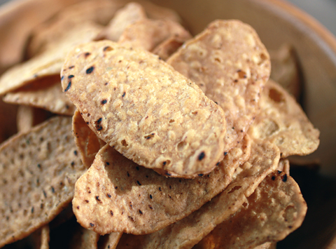 The “Multigrain” one, a mix of flax, sunflower, sesame seeds, oat fiber, brown rice, quinoa and soy has a wonderfully complex grain taste and pretty black sesame seeds baked into the chips. They had the taste of stone-ground crackers but the thinness and crunch of a sturdy chip.