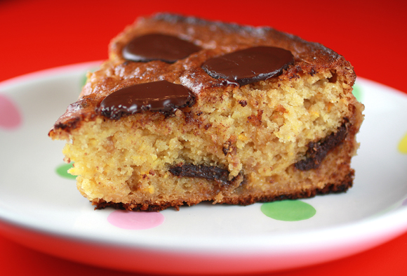 It’s recipes like this that make me not care that I can get out-of-season-and-nowhere-near-local foods. A whole orange and chocolate dots make this a must-make cake!