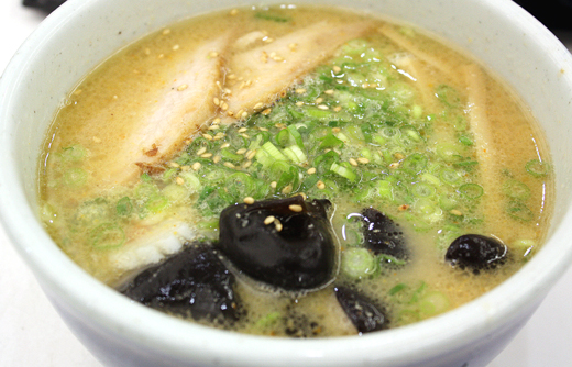 Plastic replicas of the ramen bowls greet you as you step up to the counter to order the size you want, along with your choice of salt, soy sauce, soybean paste or spicy broths.