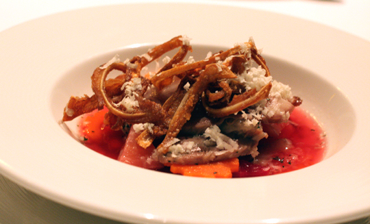When I spied “Tete de Cochon” ($11) on the menu, I was expecting a thick slab of head cheese. But it wasn’t that at all. Instead, the terrine was shaved, making it much lighter. It also was atop an almost borscht-like broth of beef consomme and beet juice that was enlivened with tangy pickled onions. The crowning touch was wispy curls of fried pig ear scattered over the top. There was a lot going on in this bowl, so that every spoonful brought a new nuance.