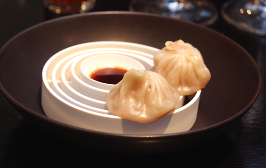 Two dumplings arrived next, perched on an artful serving dish of concentric circles, with the center one holding a dipping sauce. The xiao long bao were stuffed with foie gras and broth. Though the wrappers were a little thick at the top, the broth inside was wonderfully rich and warming.
